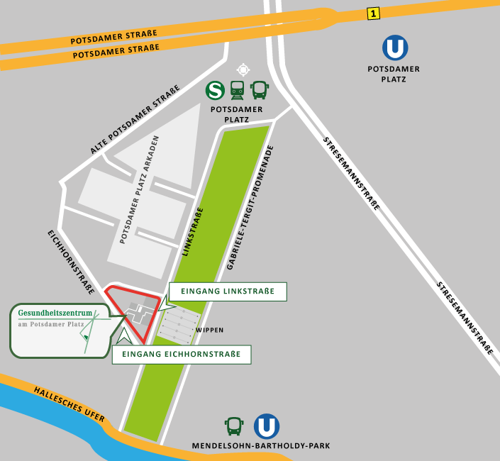 Parken ist in den weiträumigen öffentlichen Parkhäusern unter dem Potsdamer Platz möglich.